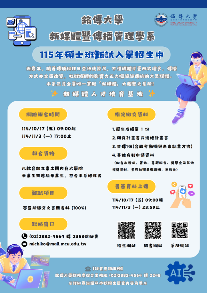 招生資訊:銘傳大學碩士班甄試入學頁面